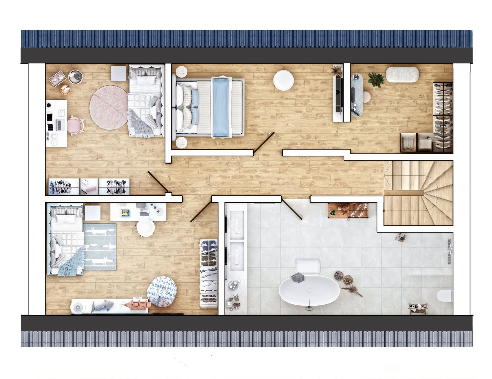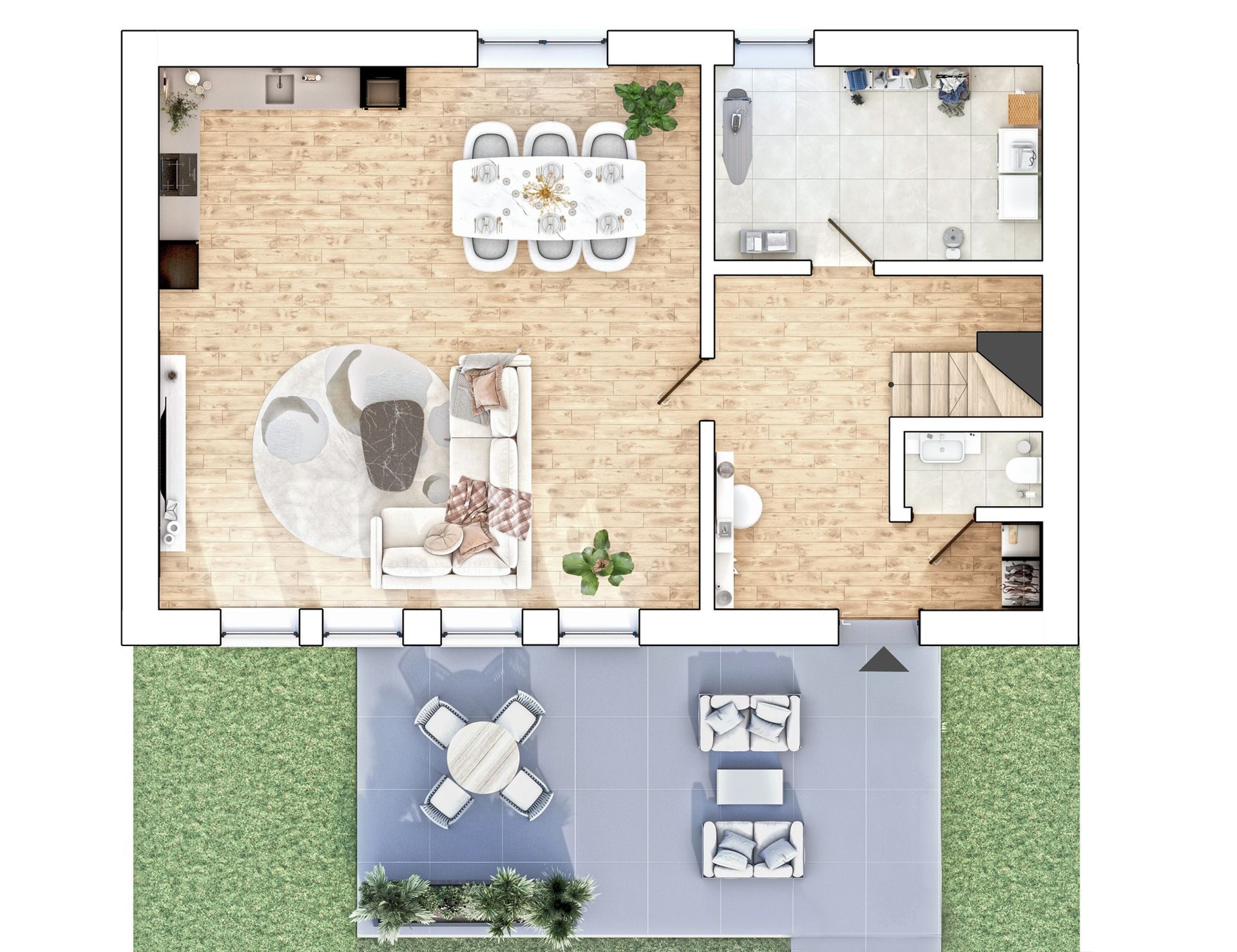 On the ground floor, you'll find open, spacious living areas with direct access to the terrace or the communal courtyard. The upper floor houses the quiet bedrooms and modern bathrooms – ideal for families or couples who value a clear separation between living and retreat areas. The total living space is 633 m².