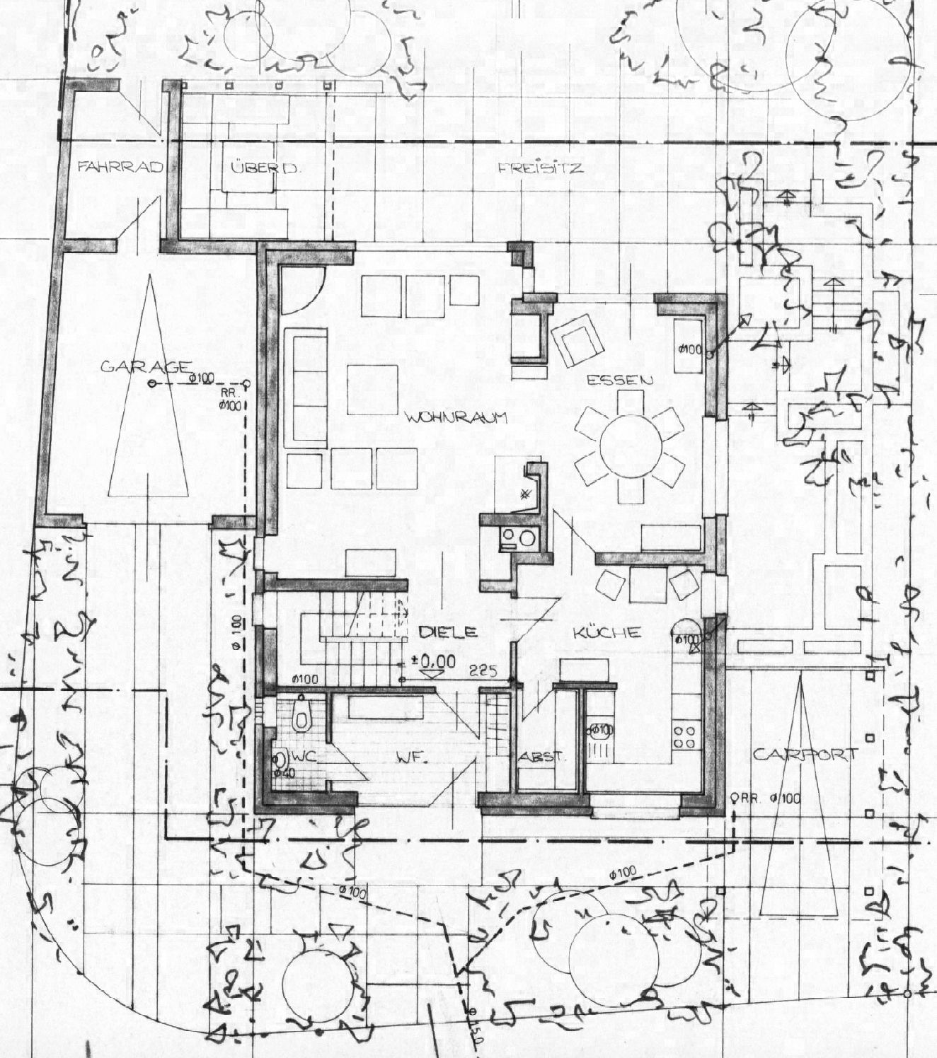 Zum Haus gehören eine Garage, ein Carport und ein Stellplatz. Der flache Teich im Garten kann bei Wunsch zugeschüttet werden – ideal für eine großzügige Rasenfläche.